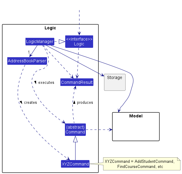 Commandobject (more precisely, an object of one of its subclasses e.g.,AddStudentCommand) which is executed by theLogicManager. - The command can communicate with the