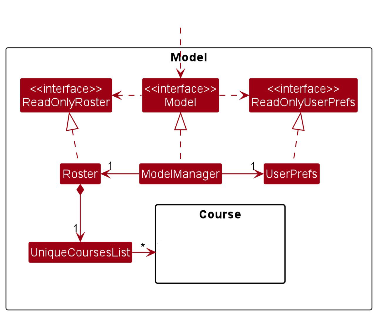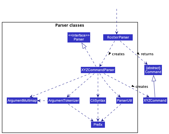 RosterParserclass creates anXYZCommandParser(XYZis a placeholder for the specific command name e.g.,AddCommandParser) which uses the other classes shown above to parse the user command and create aXYZCommandobject (e.g.,AddCommand) which theRosterParserreturns back as aCommandobject. - All